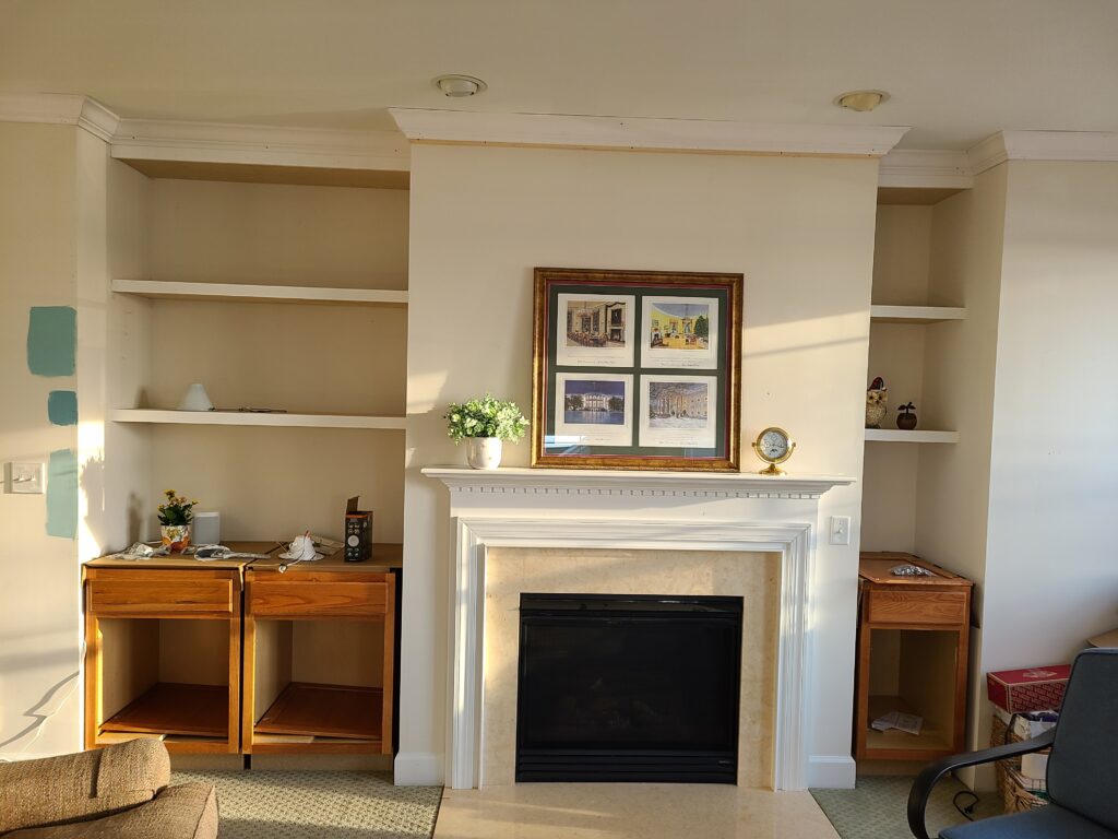 We added elegant crown molding and a stunning stone fireplace feature wall. A custom floating wood mantel and slate hearth were added, along with built-in floating shelves. Off-the-shelf base cabinets were paired with custom wood countertops, while new hardwood floors added warmth. A heavy, brown ceiling fan was replaced with recessed lighting to modernize the space. Removing heavy curtains allows natural light to flood in and take advantage of the beautiful pond view. The custom color palette, comfortable furniture, and decor create a cozy living area with a breezy coastal vibe.