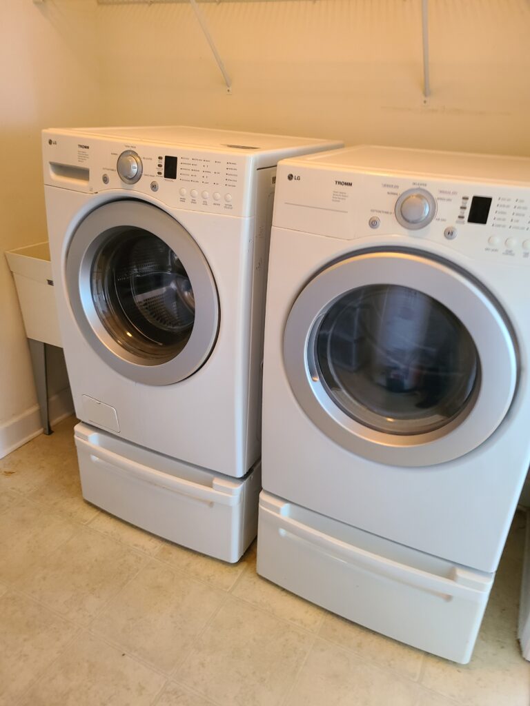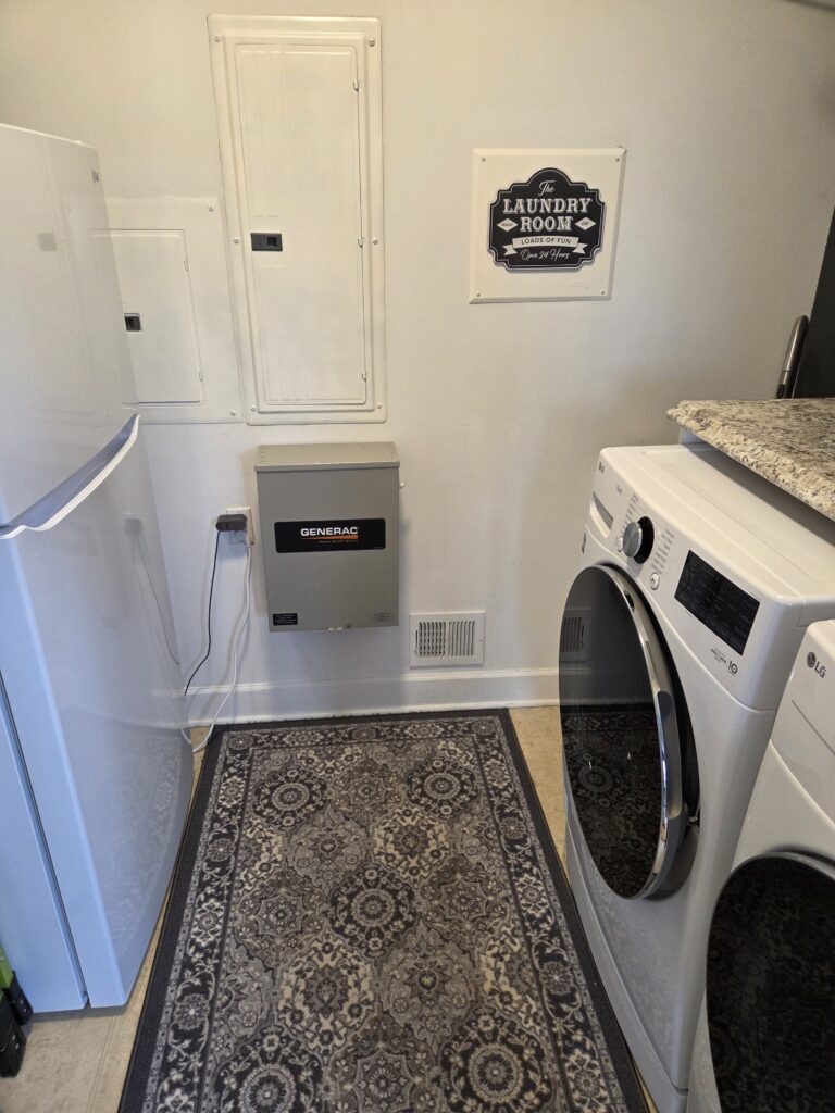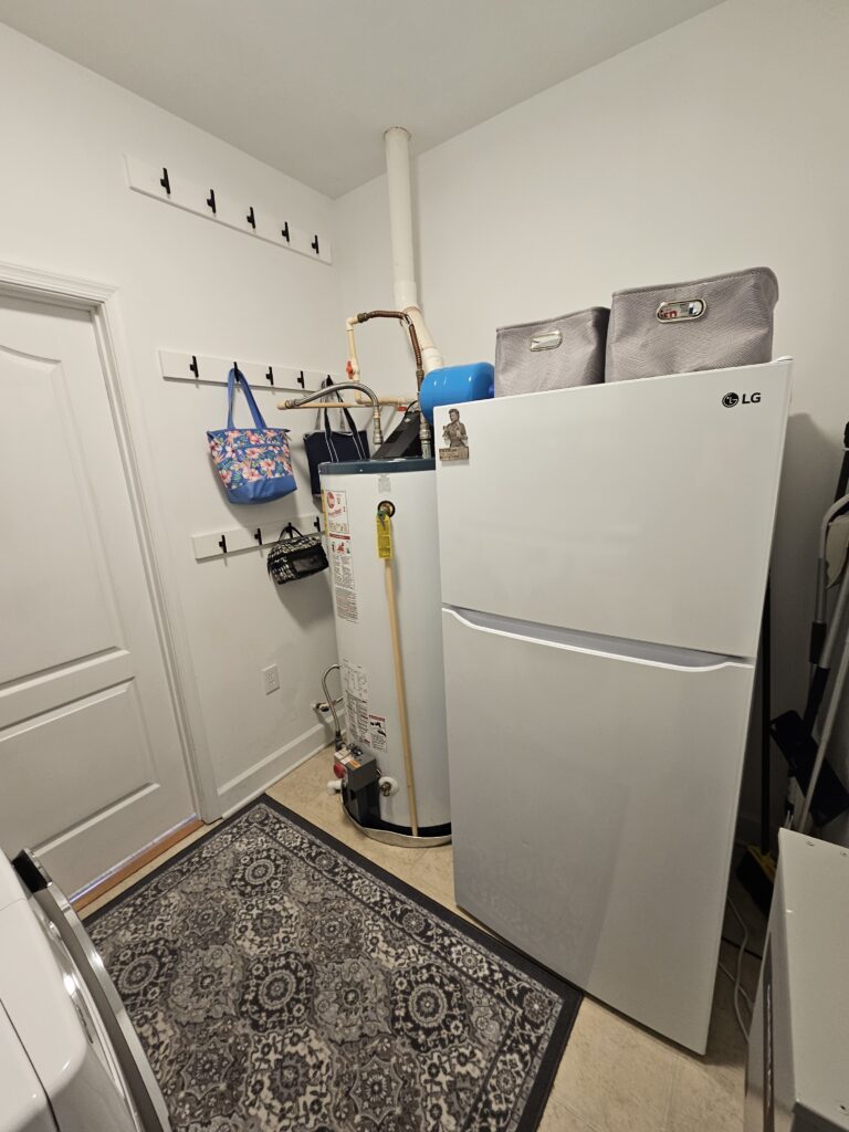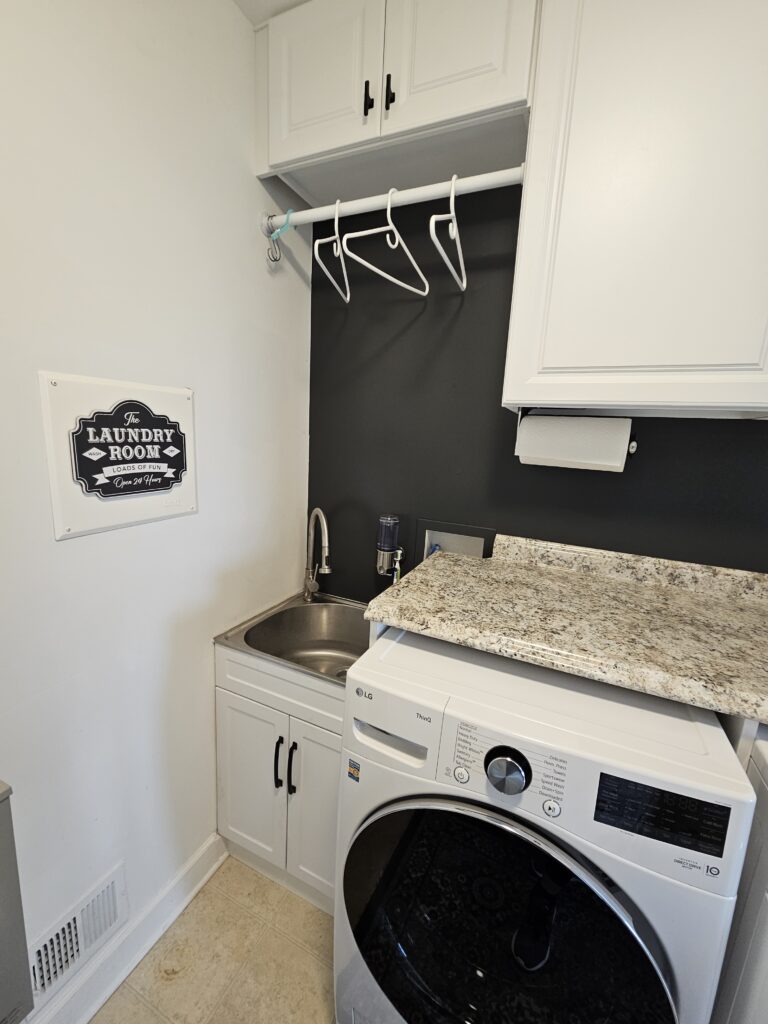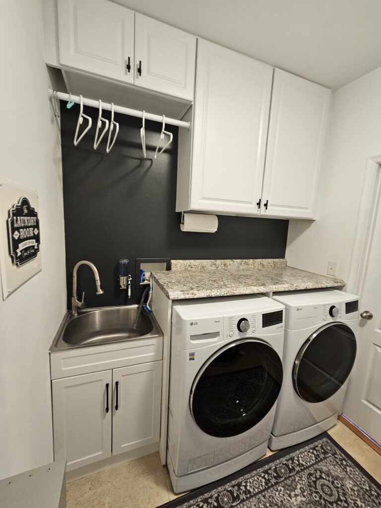 This makeover redefines utility with thoughtful upgrades that streamline everyday chores: a new washer and dryer, a supplemental fridge, an attractive sink with ample storage, a wall-mounted soap dispenser, and a convenient countertop for folding. Packing in additional storage, overhead cabinets replaced the basic wire shelving, and a drying rod was added, creating a clean and organized aesthetic in a compact space. We added fresh white paint, a bold accent wall, black wall hooks that match the cabinet hardware, playful artwork, and an accent rug to bring style to the space. Practicality meets personality in this refreshed and stylish makeover.