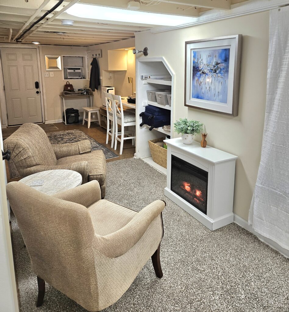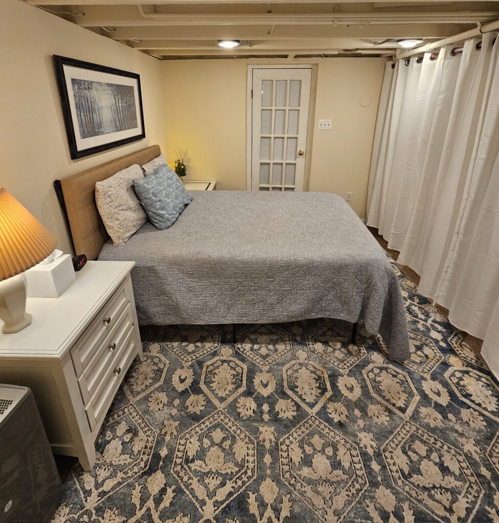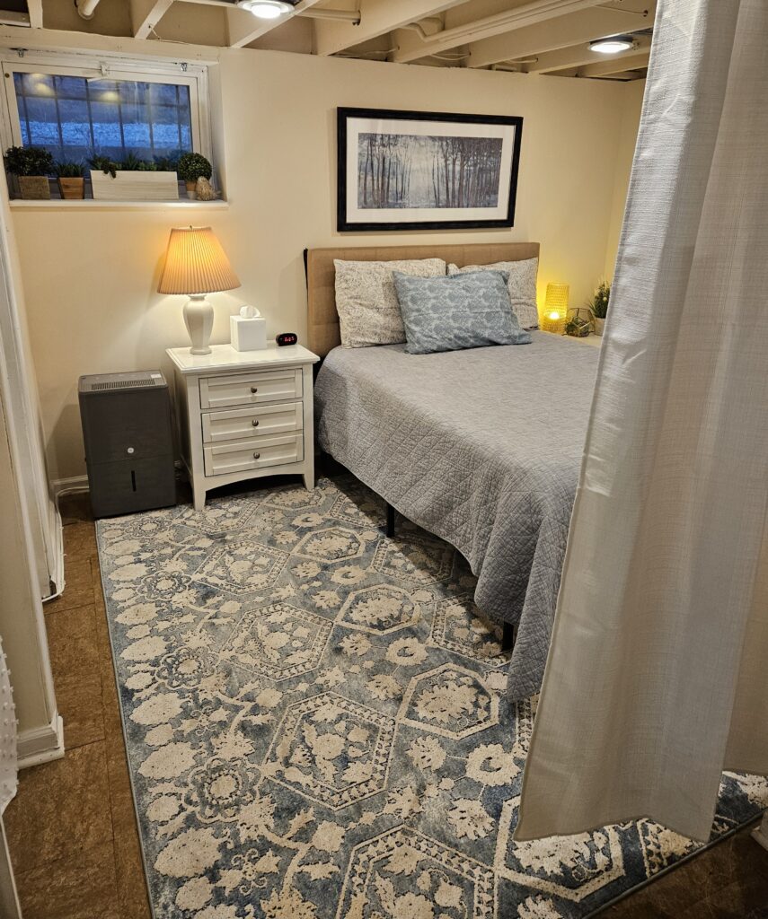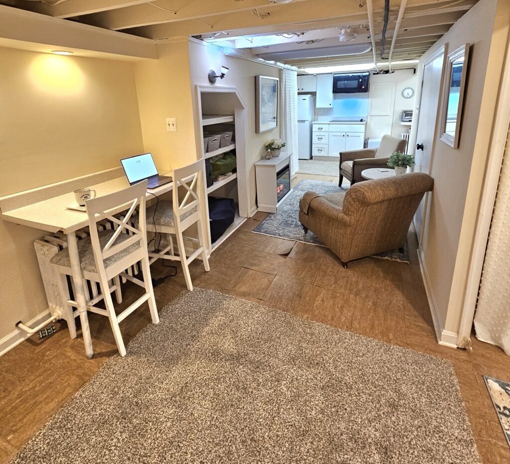 We transformed a cluttered basement with a unique color palette into a cozy, comfortable, walk-in efficiency apartment. The basement comprises one room with a separate small bathroom, laundry closet, adjacent storage rooms (for the owner), and a separate entrance for the tenant.