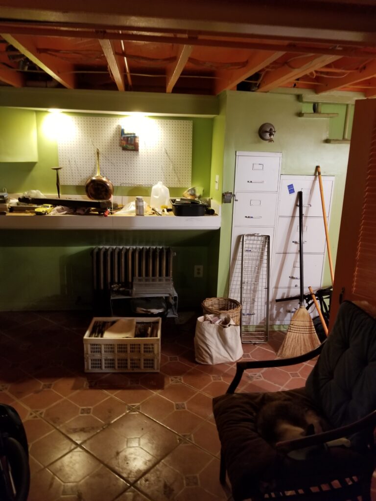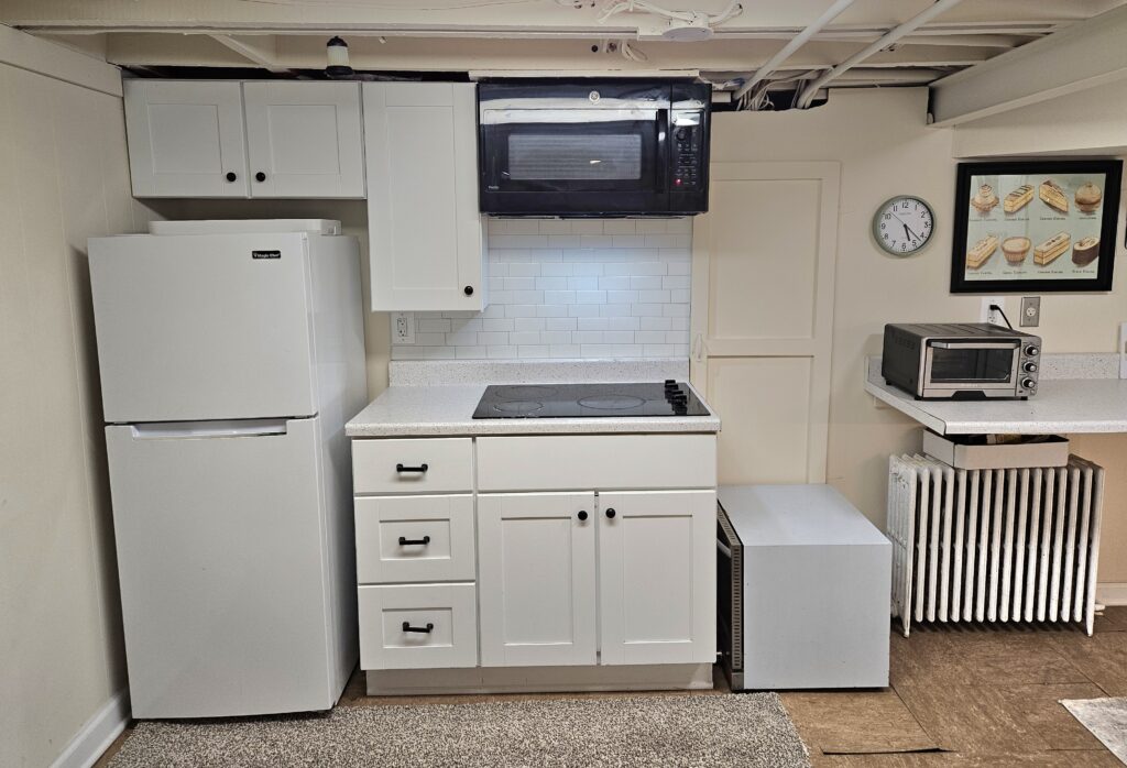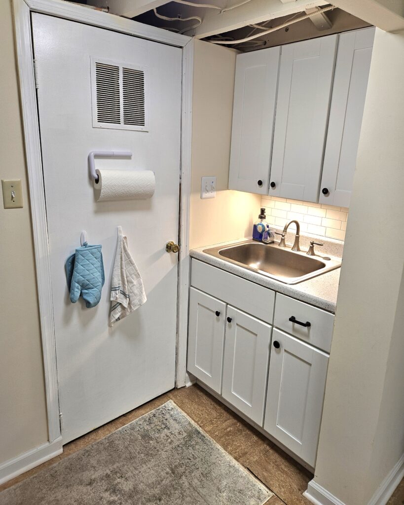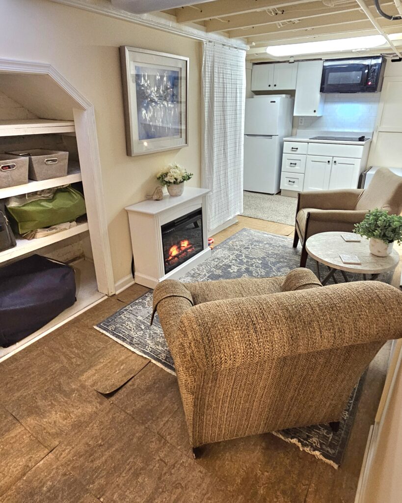 We transformed a cluttered basement with a unique color palette into a cozy, comfortable, walk-in efficiency apartment. The basement comprises one room with a separate small bathroom, laundry closet, adjacent storage rooms (for the owner), and a separate entrance for the tenant.